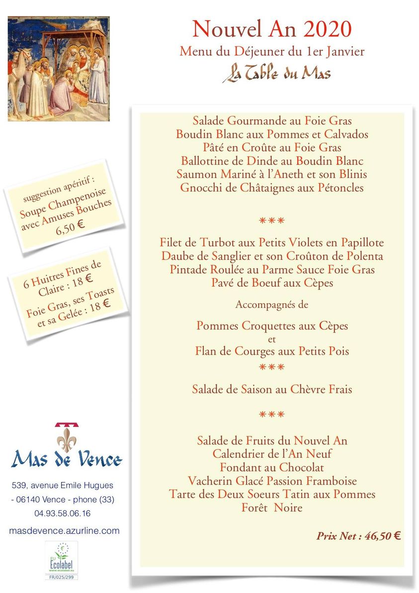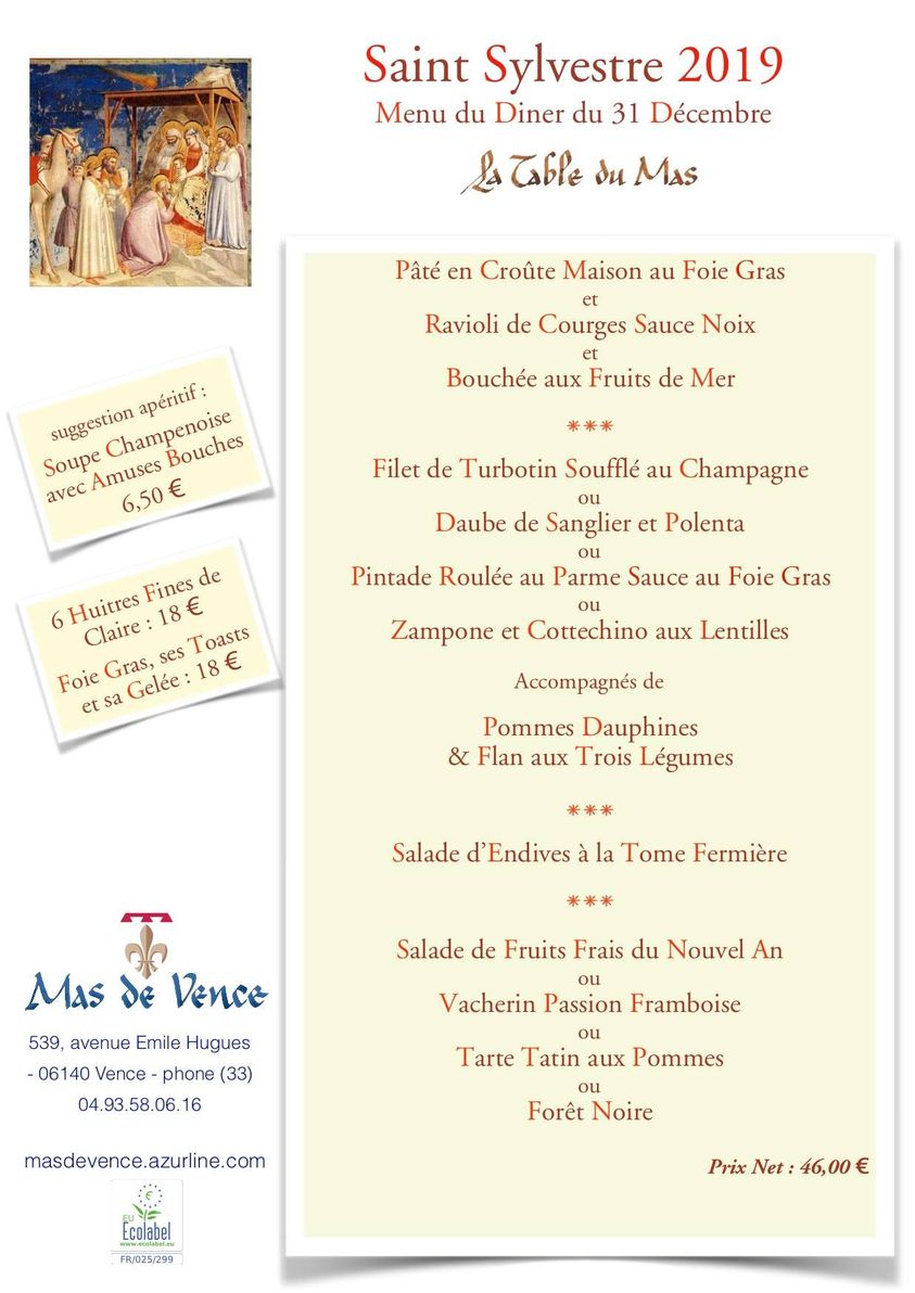Son restaurant La Table du Mas vous propose ses Menus de Fête pour la veillée de Noël, le Jour de Noël, la Saint Sylvestre, et le Jour de l'An.