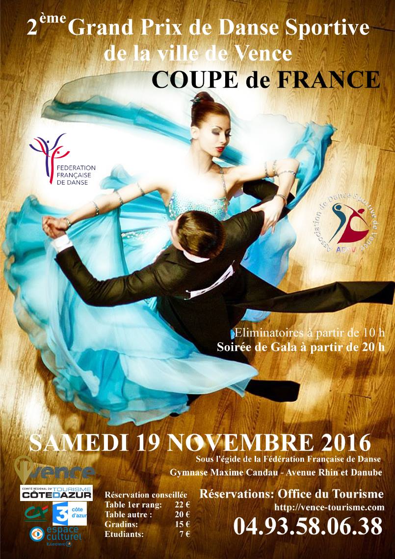 Cette année, Vence a obtenu d’être Ville organisatrice de la Coupe de France de Danse Sportive ! Une des plus importantes compétitions de l’année, puisqu’elle permet de constituer l’équipe de France qui représentera l’Hexagone dans les manifestations internationales (championnat d’Europe et du Monde par exemple). Ainsi les meilleurs couples français vont se déplacer afin de pouvoir entrer dans l’équipe de France. L’élite de la France s’affrontera sur le parquet du gymnase Maxime Candau... Cette année, un couple Vençois vient d’entrer en série internationale ! Il représentera les couleurs de Vence dans cette coupe de France.