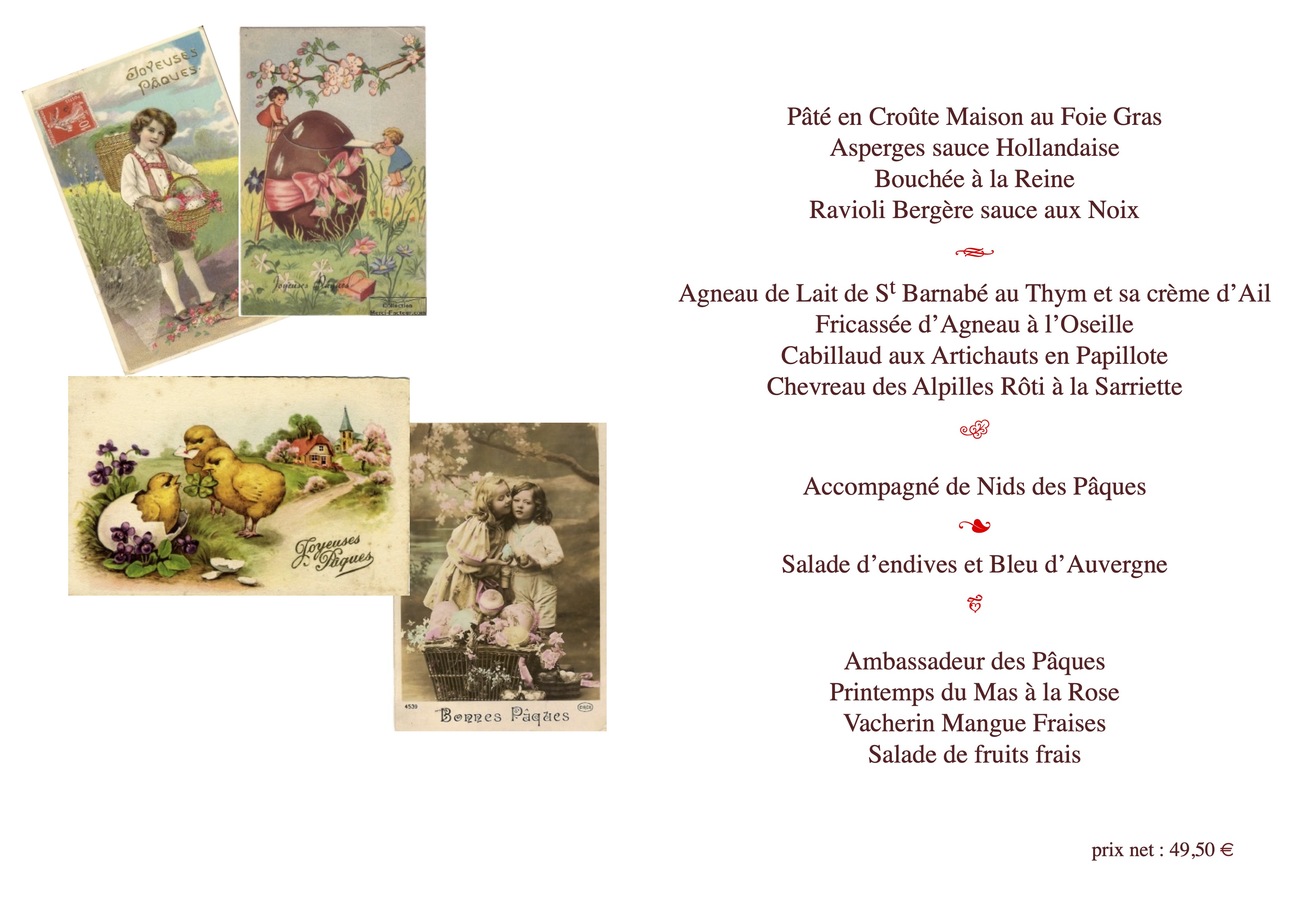 Notre restaurant La Table du Mas vous propose son Menu de Pâques pour le déjeuner de Dimanche 9 Avril 2023